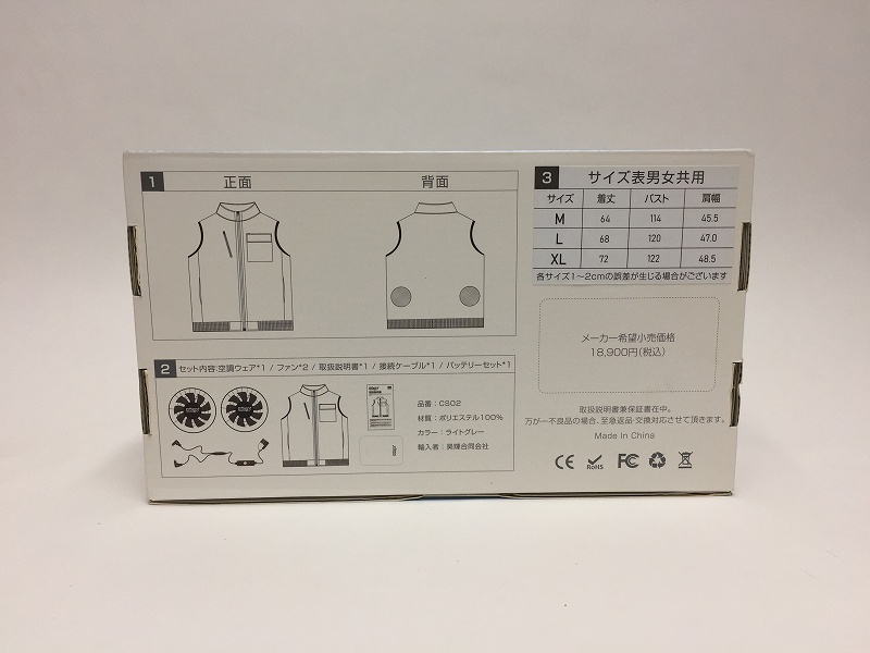 | コメント | 未開封の商品でしたが撮影のために一度開封しています。 セット内容は空調ウェア、ファン、取扱い説明書、接続ケーブル、バッテリーセットなので充電していただければすぐにお使いいただけます。 暑くなってくるこれからの季節に、外での作業や室内でもエアコンがあまりきかない場所等で熱中症対策にご使用ください。 |