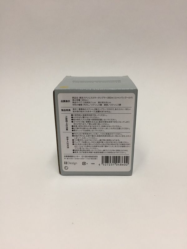 | コメント | 未使用品ですが撮影のために一度開封しています。 シャンパンゴールドのステンレスタンブラーで、満水容量350ミリリットルです。 真空二重構造なので、温かい冷たい飲み物の飲み頃をキープし結露もありません。 2個セットなので、家族やお友達と一緒に使用されてはいかがでしょうか? |